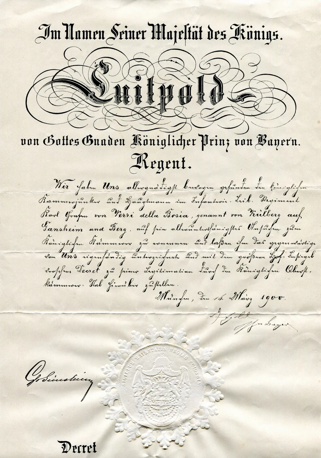 Dekret über die Ernennung des Karl Grafen von Verri della Bosia zum königlich bayerischen Kämmerer