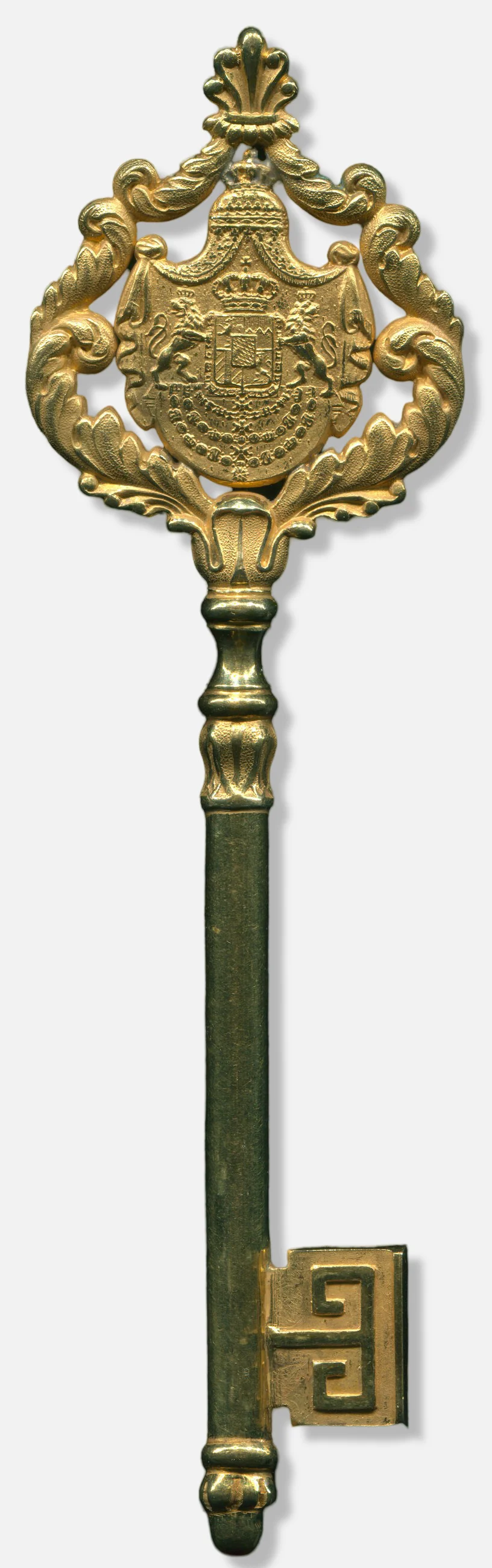 Das ehemalige Herzogtum Bayern, das 1623 zum Kurfürstentum und 1806 zum Königreich erhoben wurde, entwickelte sich im Deutschen Reich nach 1871 zum zweitgrößten Bundesstaat – sowohl nach Fläche als auch nach Bevölkerungszahl. Um 1900 erstreckte sich Bayern über fast 76.000 km² und zählte mehr als sechs Millionen Einwohner. Bis zum Ende der Monarchie im Jahr 1918 blieb das Land in der Hand der Wittelsbacher. Die Kammerherrenschlüssel der ab 1745 regierenden bayerischen Herrscher bestanden aus feuervergoldeter Bronze, waren 19,5 cm lang und zeigten am Griff unter einem Kurhut das bayerische Wappen mit aufgelegtem Reichsapfel – dem Symbol des Erztruchsessenamtes. Unterhalb befanden sich als hängende Kleinorden das Goldene Vlies sowie der Hubertusorden. Varianten dieser frühen Modelle betreffen vor allem den Kurhut und die Gestaltung des Bartes. Nach dem Aussterben der bayerischen Linie der Wittelsbacher folgte 1777 Carl Theodor (1724–1799), bisher Kurfürst der Pfalz. Er hatte bereits in Mannheim einen großen Kämmererstab aufgebaut. Die von ihm verliehenen Schlüssel tragen unter dem Kurhut das Monogramm „CT“ und wurden in verschiedenen Materialien gefertigt. Die vergoldeten Bronzeschlüssel, die heute in mehreren Museen verwahrt werden, messen zwischen 14,9 und 15 cm und unterscheiden sich hauptsächlich in der Ausführung der Ziselierungen. Zwei weitere, 17,6 cm lange Exemplare bestehen teilweise aus Eisen: Kopf und Schaft sind eisern, während Monogramm und Verzierungen aus vergoldetem Messing bestehen. Teile des Kurhuts, das Ornamentwerk und der Bart sind dunkelblau glasiert. Ein weiterer eiserner Schlüssel von 14 cm Länge zeigt ein eingeschnittenes Monogramm und einen durchbrochenen Kurhut.