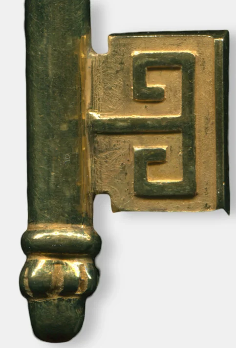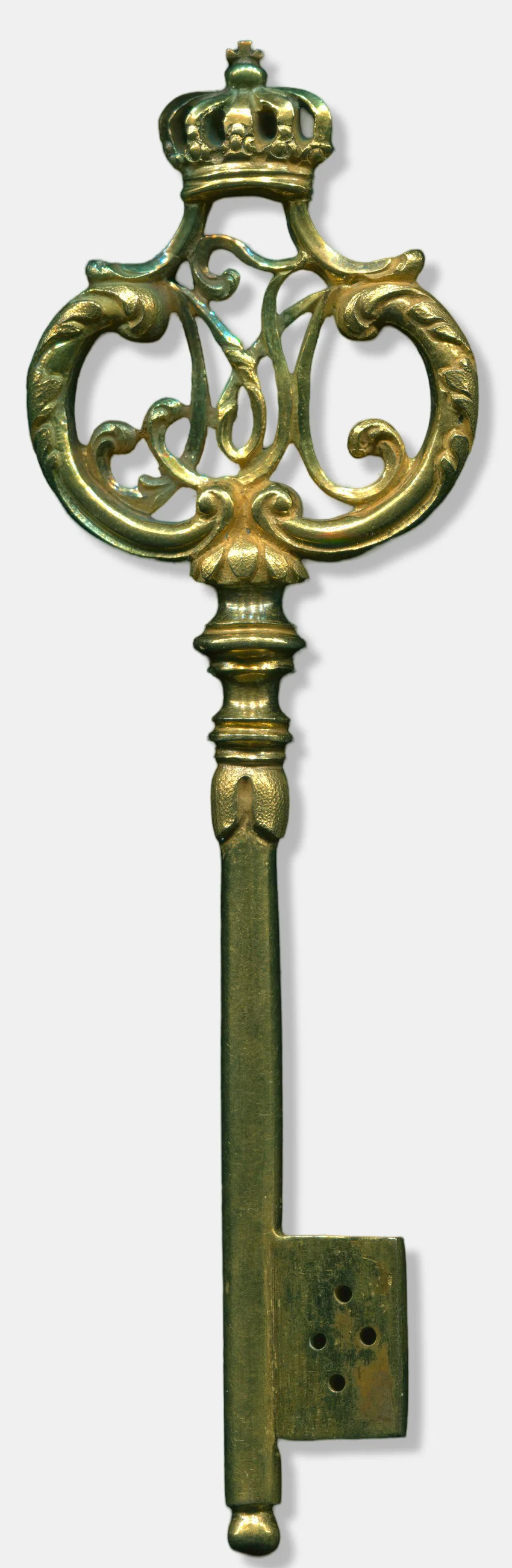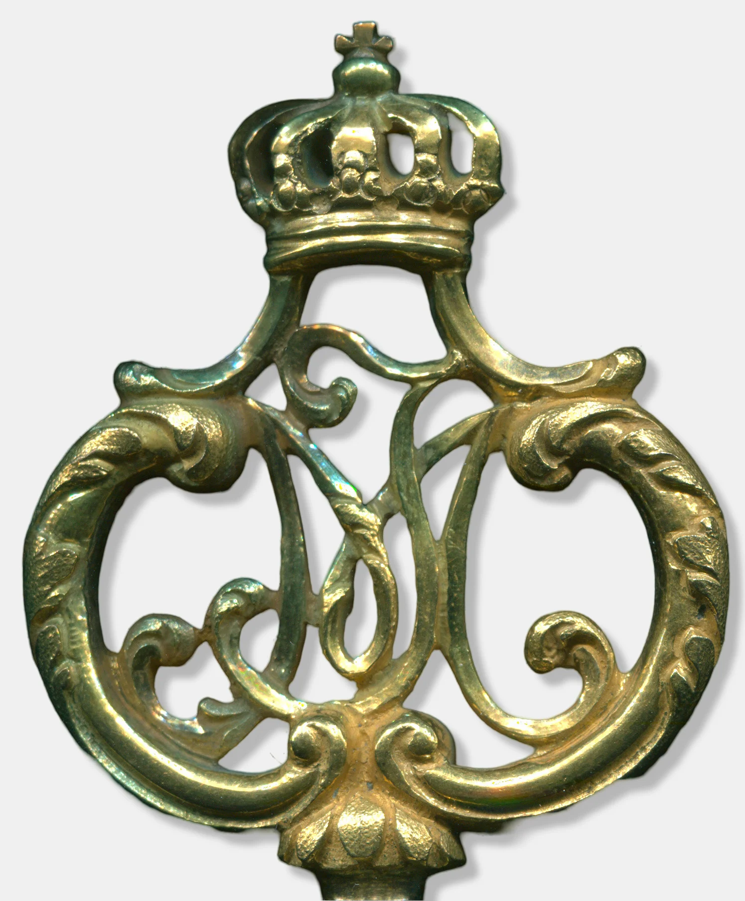 Stutzig wurde ich darüber jedoch, als ich einen identischen Kammerherrenschlüssel in einer Hermann Historica Auktion fand. In dieser Auktion wurden gut eine Hand voll Kammerherrenschlüssel aus der Familie Freiherrn von Leonrod versteigert. Die dort versteigerten Schlüssel waren alle mit recht glaubhaft dargestellten Kärtchen versehen, welche die Inhaber der Schlüssel angegeben haben. Die Zuordnungen der Namen zu den Schlüsseln waren auch recht glaubhaft nachvollziehbar. Demnach soll es sich um einen aus vergoldeter Bronze gefertigten, fein ziselierten und feuervergoldeten Kammerherrenschlüssel aus der Regierungszeit (1806-25) König Maximilian I. Joseph von Bayern handeln.